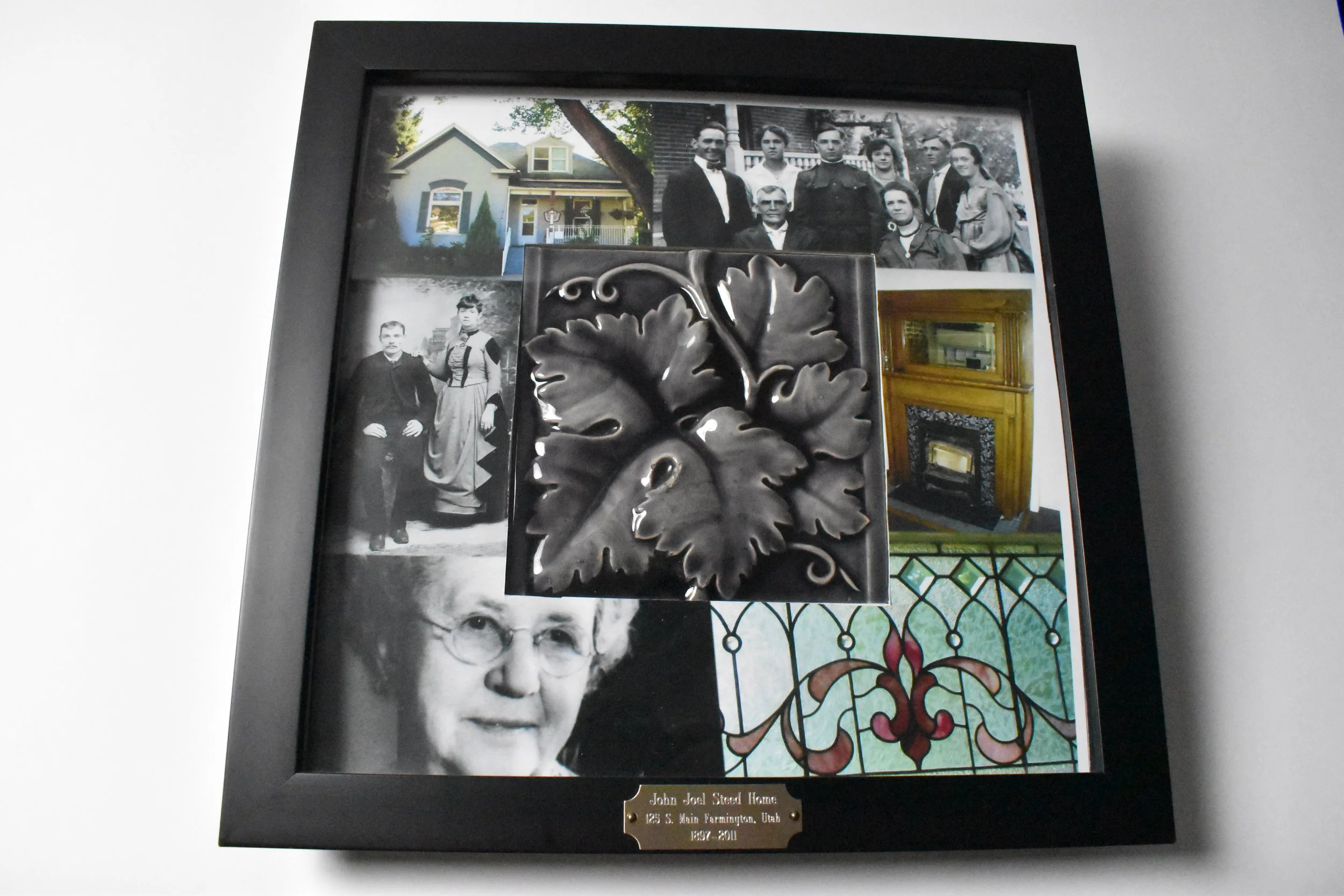 The Steed Home Shadowbox: This shadowbox was donated by the family in honor of the John Joel Steed home at 125 S. Main Street in Farmington, Utah. The house was built in 1847 and was removed in 2011 for new construction. The shadowbox includes a photo of the home in its prime, images of family members who lived there over generations, a picture of the stained glass window also donated to the museum, an image of the tiled fireplace, and an original tile taken from the house before demolition. This piece shows how deeply families in Farmington feel connected to their homes. One of the museum’s largest ongoing projects is mapping historic houses in the city center and tracing the lives of the people who lived in them.